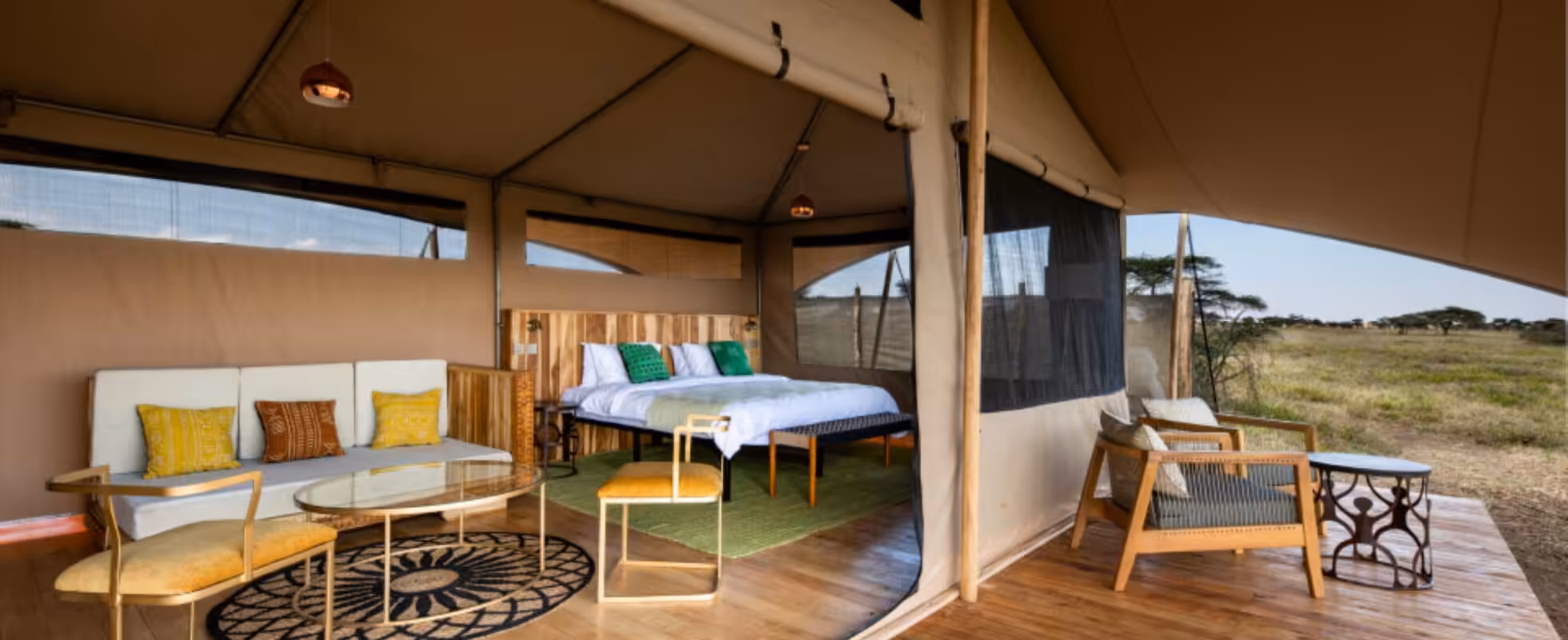 Lolkisale Tarangire Camp is a serene and luxurious getaway in the Tarangire National Park. The camp has 8 custom-designed safari tents, on an elevated wooden platform. Located right by the wetlands, you see herds passing through in search of water from your private porch at the break of day. Thoughtfully selected interiors, with soft natural colours and textures, and a comfy bed give you just that extra touch of comfort you need on a safari. In the dining tent and lounge area you can enjoy great meals, great conversations, and a good nightcap from a well-stocked bar. You don’t need much more on safari in the African bush!