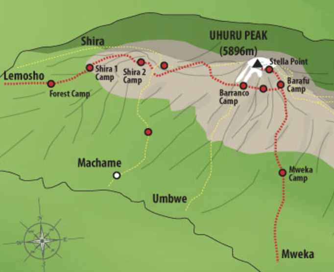 Today you start your incredible journey via the Lemosho Route. Your guide picks you up in the morning and takes you on an approximately 4-hour drive to the western entrance of Kilimanjaro National Park (2,200 m). The road leads through a beautiful tropical rainforest after which you arrive at the drop-off point at 3,500 meters where you can admire the beautiful Shira plateau. The walking route to the first camp is flat which allows you to get used to the high altitude.