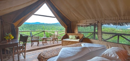 Rhotia Valley Lodge sits on a hill, offering views of nearby plantations and the Ngorongoro forest, as the lodge lies between the Ngorongoro Conservation Area and Lake Manyara National Park. The lodge is made up of 15 tented safari rooms, each with a veranda to enjoy the view from. Inside, you’ll find a king-sized bed, mosquito net, and an ensuite bathroom with hot water for those post-safari refreshers. In the main area, you’ll find a refreshing pool, a dining area with a terrace for your sunsets and WiFi to send out your pics of the day.