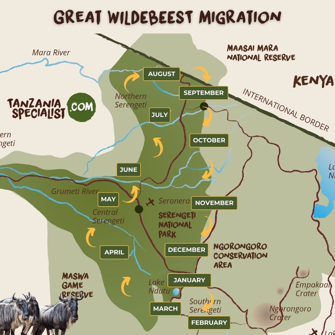 You can witness the wildebeest migration anytime of the year, since the animals migrate in a circle between the Serengeti and Masai Mara (Kenya). The exact timing of the Serengeti wildebeest migration depends upon the rainfall patterns each year. Thanks to our experienced Tanzania Specialist guides, we are able to make a fairly accurate prediction.